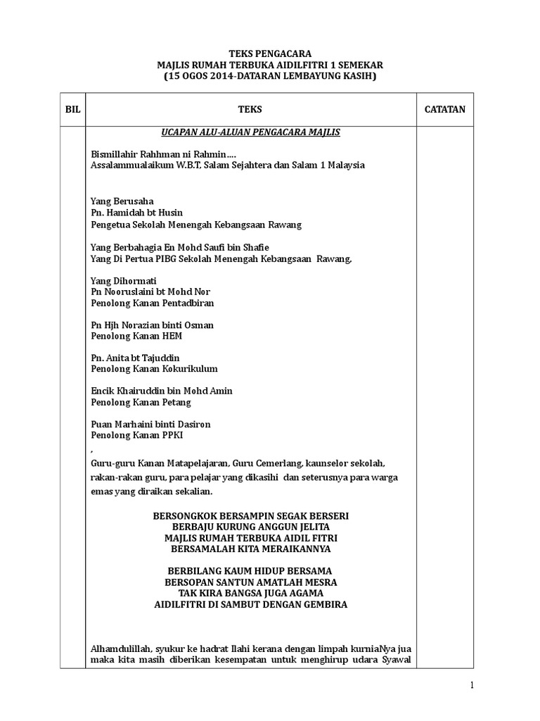 Teks Pengacara Majlis Rumah Terbuka Aidilfitri 1 Semekar 150814 Pdf